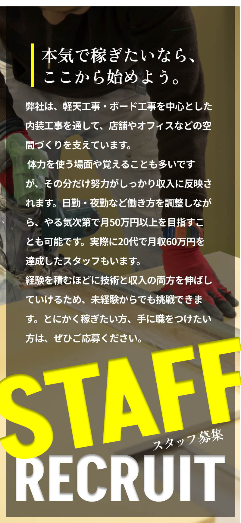 【自由な働き方&月収60万円も可能!】寝屋川市で内装工事スタッフ募集!